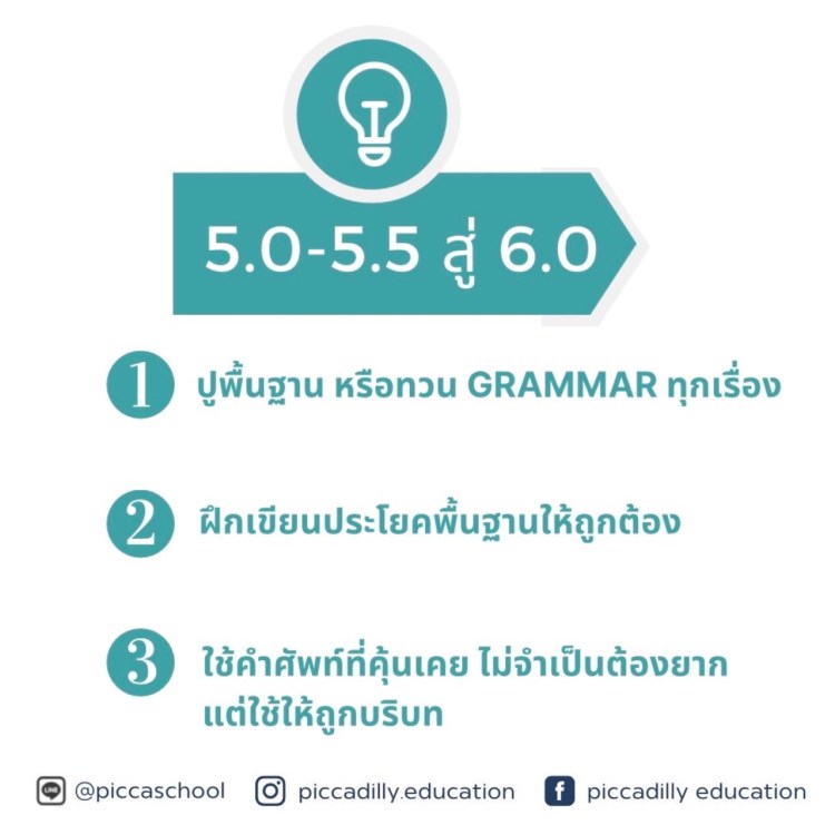 วิธีอัพคะแนนจาก IELTS 5.0-5.5 สู่ 6.0 : แนะนำให้เริ่มจากการทำความเข้าใจ grammar และ ฝึกเขียนประโยคพื้นฐานให้ถูกต้องก่อน เขียนเป็นประโยคสั้นๆ ง่ายๆ ให้อ่านแล้วเข้าใจได้ เลือกใช้ศัพท์ที่ไม่ต้องยากมาก แต่เราคุ้นเคย และใช้ได้ถูกต้อง